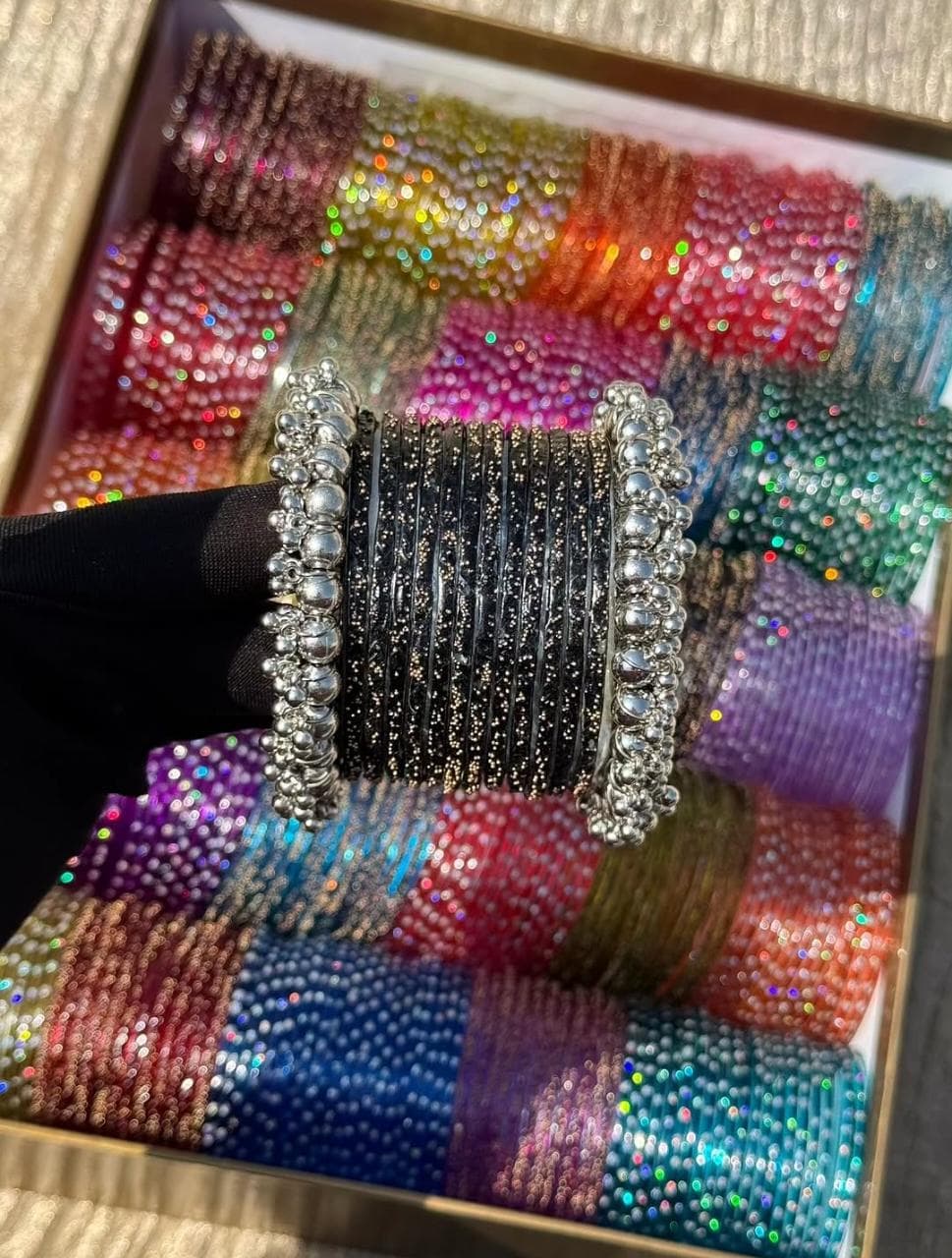 Black RainDrop Glass Bangles Silver Gajra Set