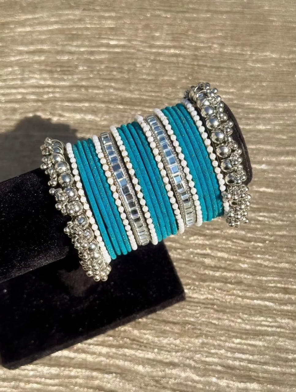 Sea Green Velvet Bangles Silver Kundan Silver Gajra Set