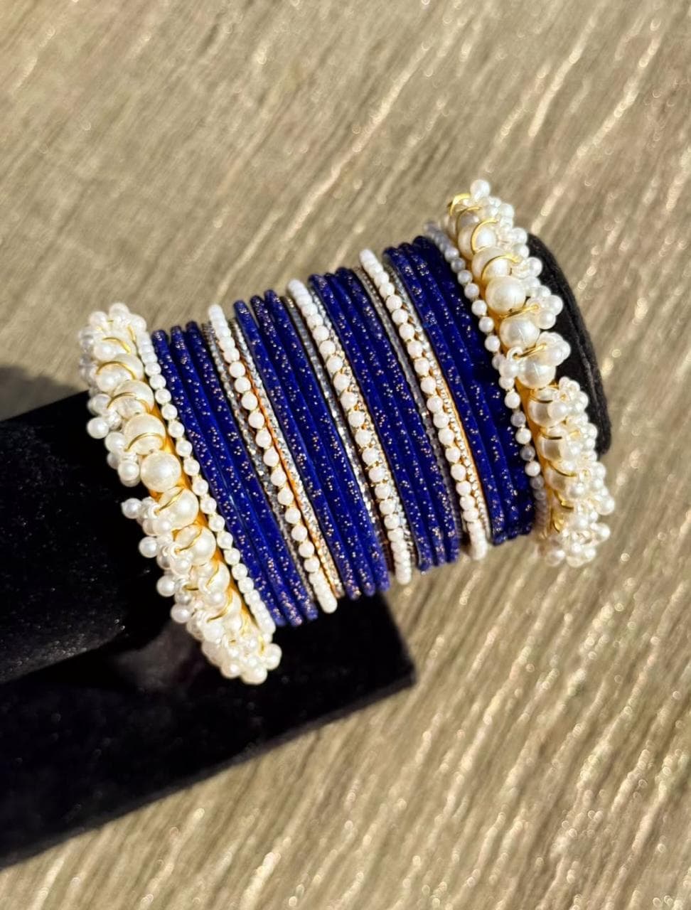 Dark Blue Velvet Bangles Pearl Gajra Set