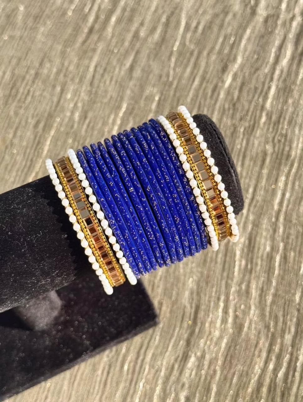 Dark Blue Velvet Champagne Kundan Bangle Set