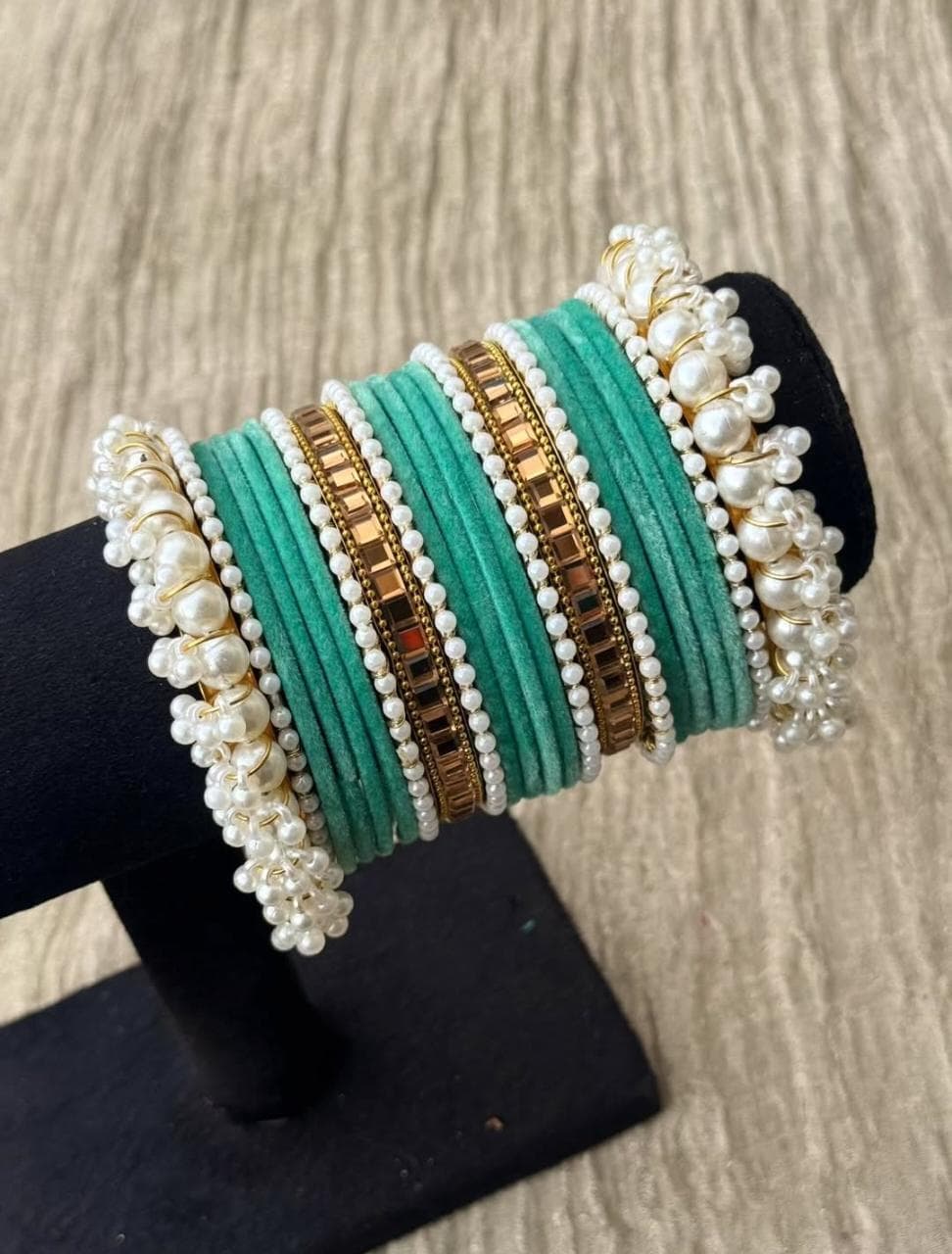 Be the first to review “Lake Blue Velvet Bangles Champagne Kundan Pearl Gajra Set”