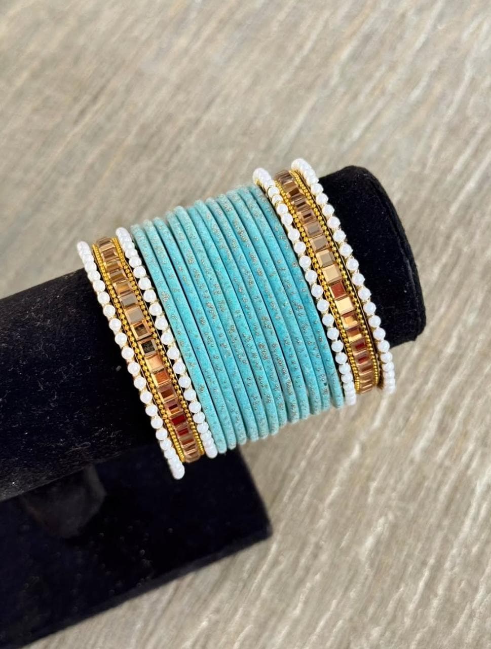 Be the first to review “Light Blue Velvet Champagne Kundan Bangle Set”