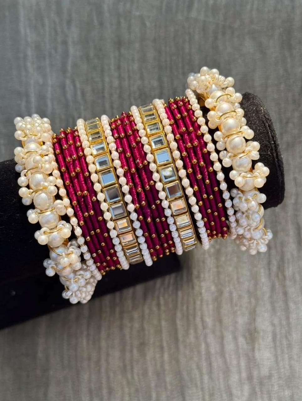 Magenda Silk Thread Beaded Kundan Kara Pearl Bangle Set