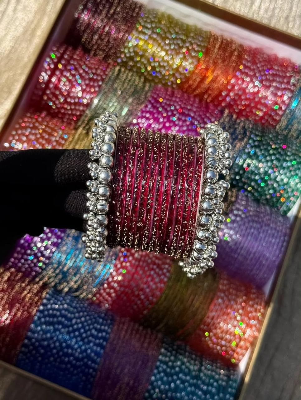 Be the first to review “Maroon RainDrop Glass Bangles Silver Gajra Set”