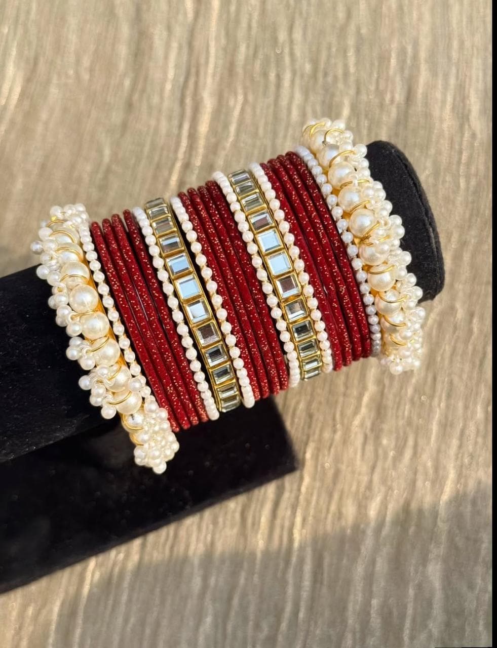 Maroon Velvet Bangles Kundan Kara Pearl Gajra Set