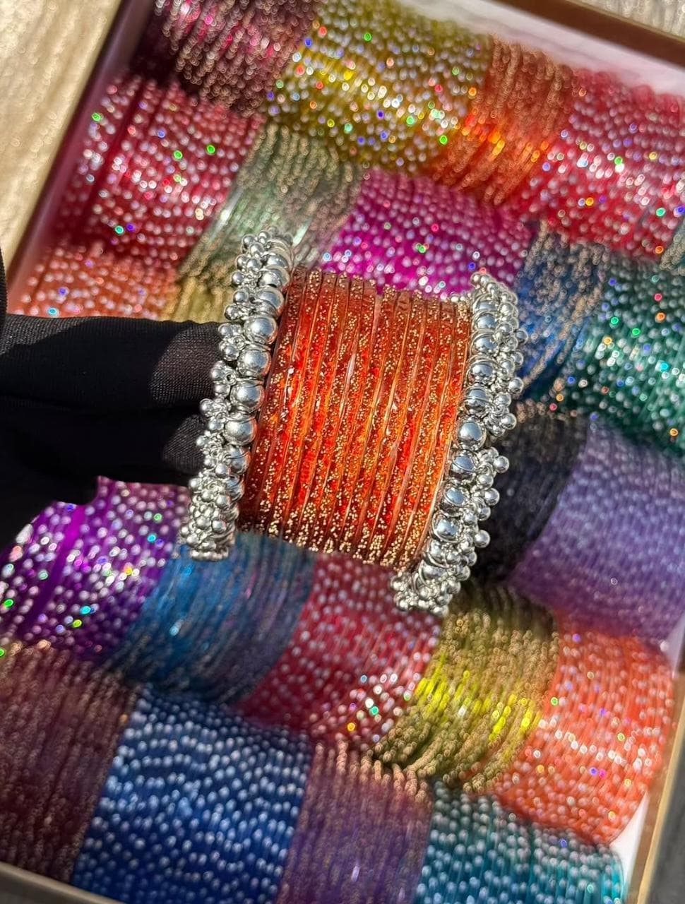 Be the first to review “Orange RainDrop Glass Bangles Silver Gajra Set”