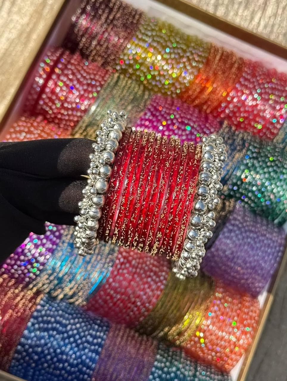 Be the first to review “Red RainDrop Glass Bangles Silver Gajra Set”