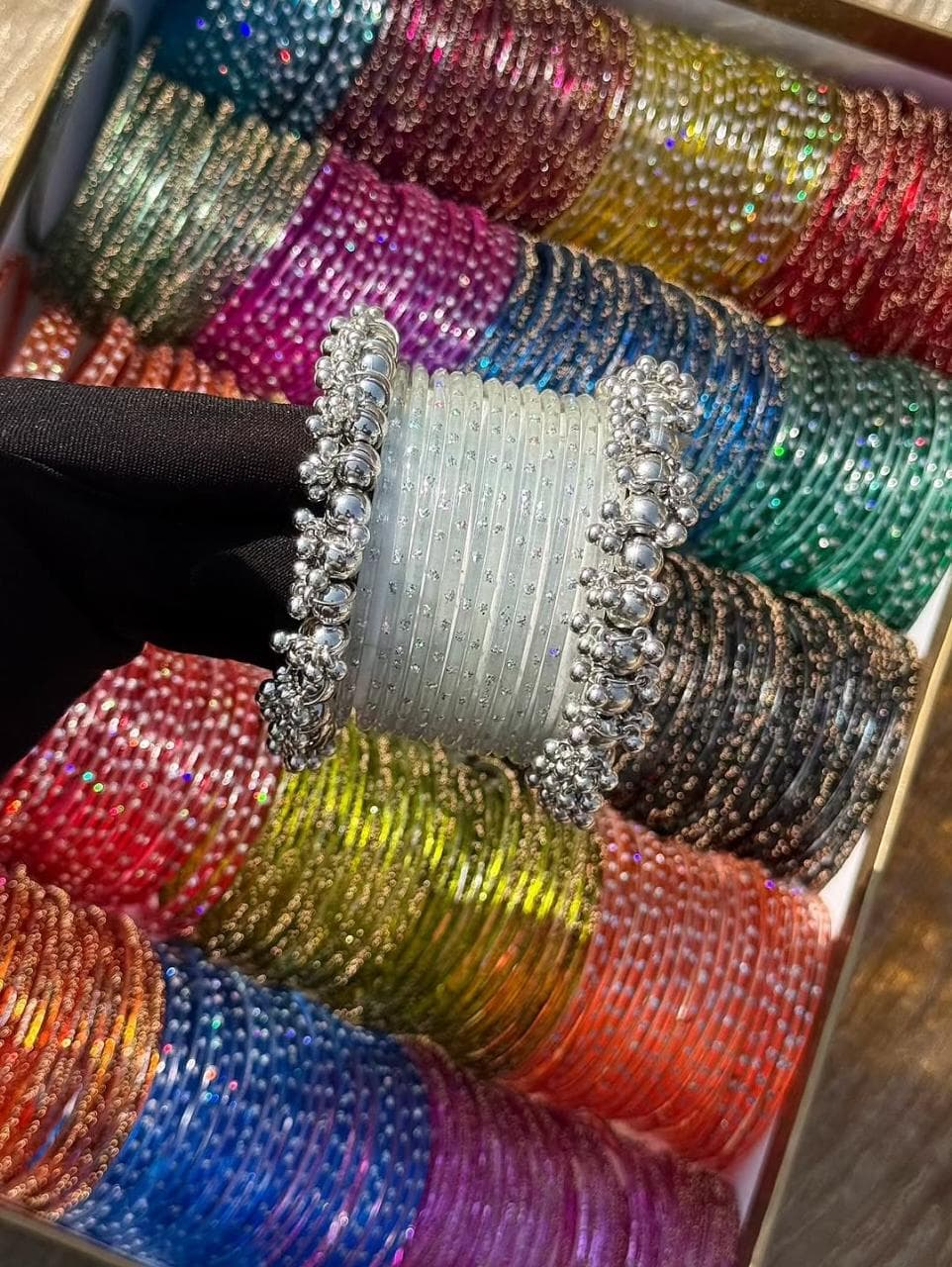 Be the first to review “White RainDrop Glass Bangles Silver Gajra Set”