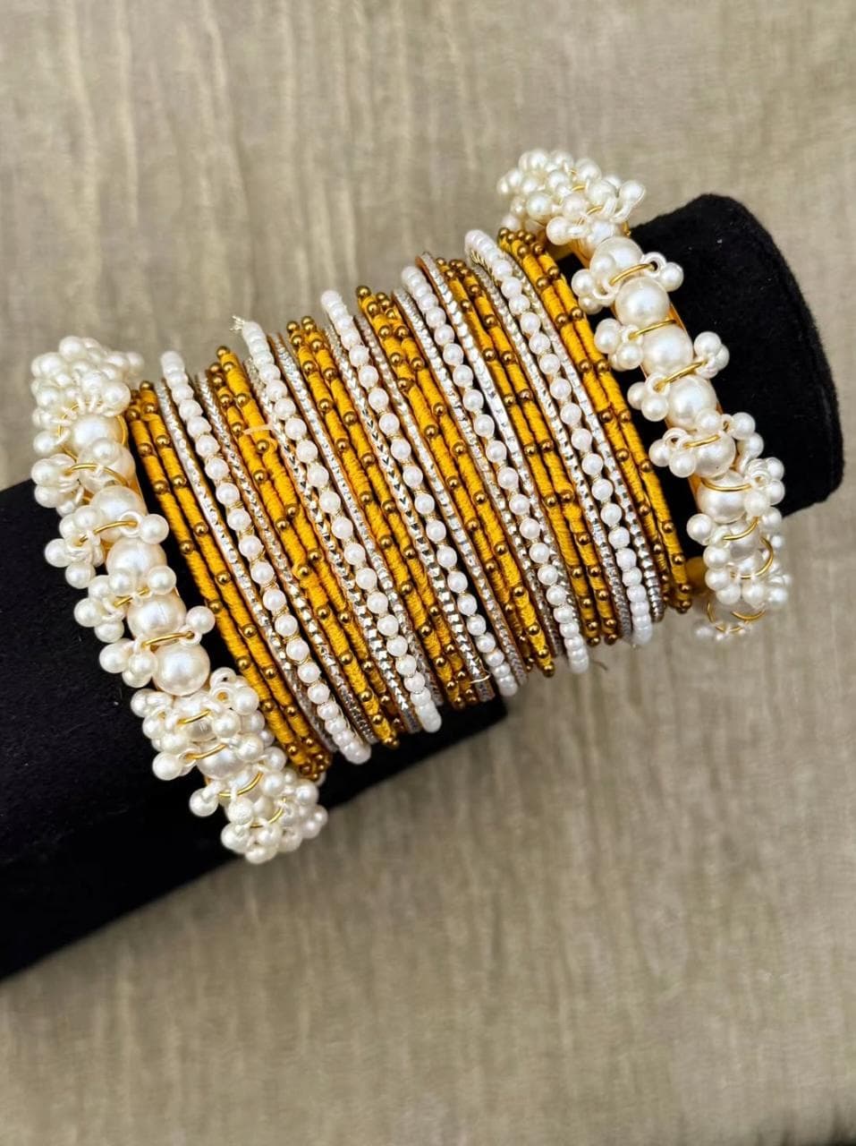 Yellow Silk Thread Beaded Pearl Bangle Set